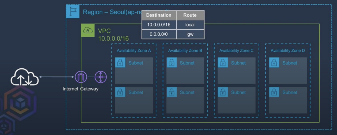 - 하나의 subnet은 하나의 routing table에 연결이 되어 있어야 함